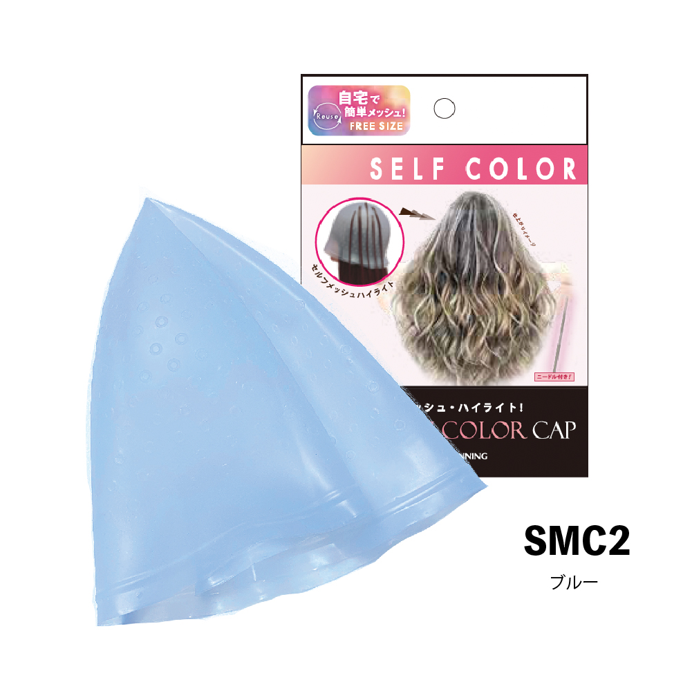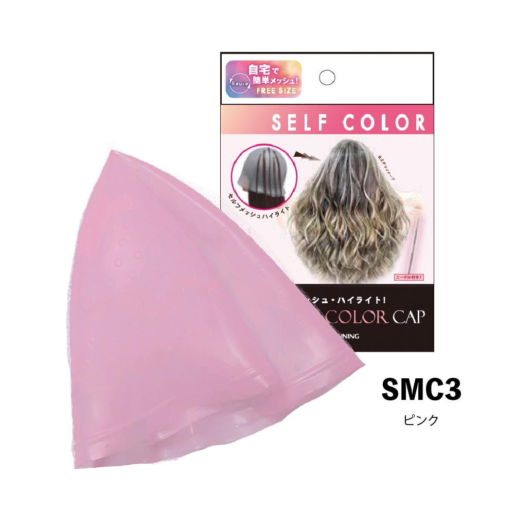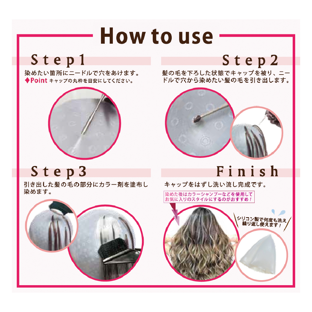 メッシュ、ハイライト、ローライトの毛束の取り分けや塗布が簡単に洗って繰り返し使えるシリコン製キャップ。